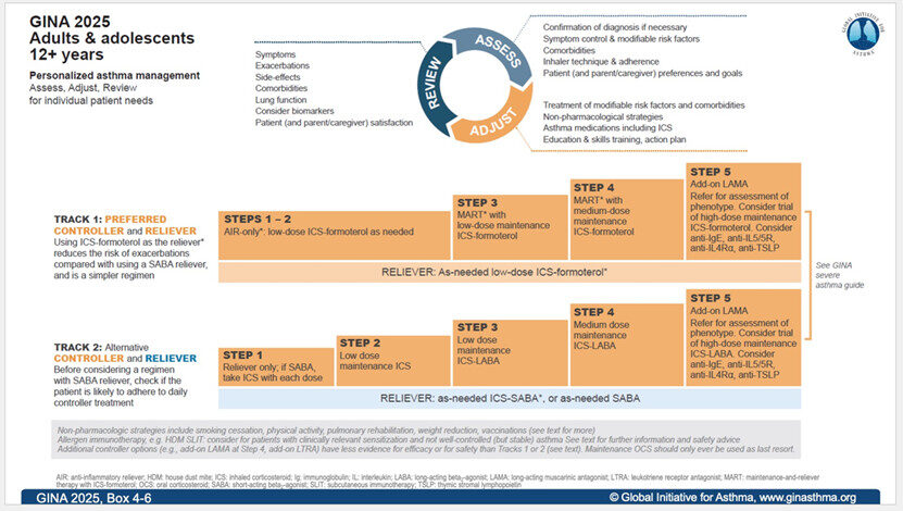 GINA has significantly revised its stance on the use of inhaled short-acting beta2 agonists (SABA) in asthma management. Historically, SABAs were widely used as first-line relievers for acute symptoms. However, GINA now discourages SABA-only treatment due to growing evidence of associated risks.