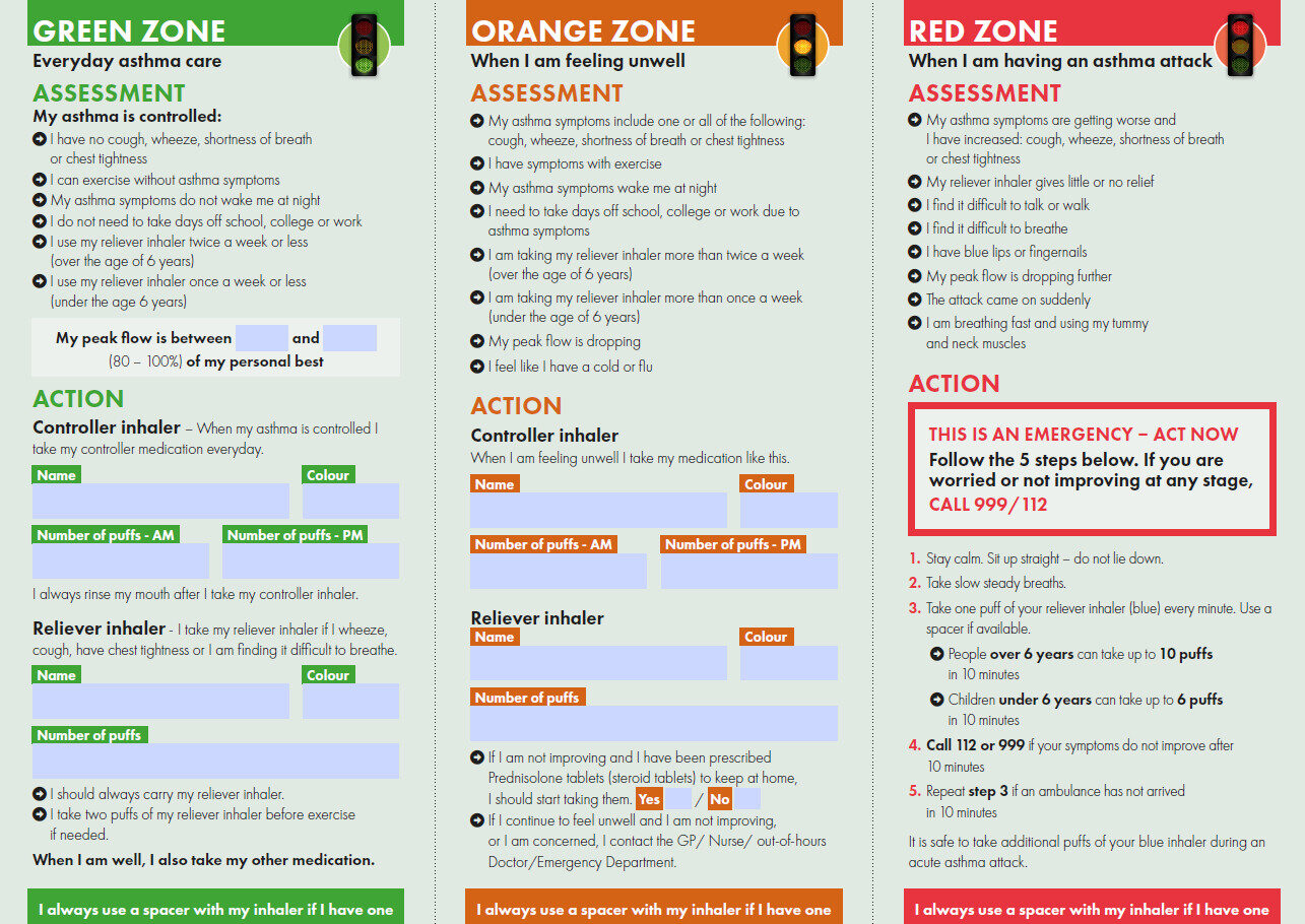 Pharmacists can assist patients in completing and updating their asthma plans, which include a green zone representing their daily medication and symptom-free routine, a yellow zone indicating early warning signs, and a red zone representing emergency symptoms and when to seek urgent care.