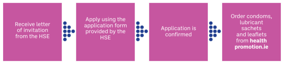 Community pharmacies in the Republic of Ireland are eligible to apply. To assist with the operational implementation of this service pharmacies will be onboarded over eight phases on a month-by-month basis. Pharmacies have been divided into eight groups of approximately 200 pharmacies per group. The eight groups have been chosen based on an urban-rural geographical spread. For each phase, the relevant pharmacies will receive a letter of invitation notifying them that they are now eligible to apply. The letter or invitation will contain an application form within the appendices. If they wish to partake in the service, they can complete and submit the form to the NCDS for review and approval. To support with phased stock allocation, pharmacies are asked to make every effort to submit their application form within four weeks of being contacted by the NCDS. Once the application has been reviewed and approved, pharmacies will be required to register on the Health Promotion website healthpromotion.ie, and then place orders for condoms and lubricant sachets, leaflets and display boxes.