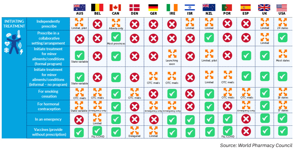 Nova Scotia — which now holds the status of the most advanced community pharmacy scope of practice authorisation in the world — continues to expand community pharmacy clinics that provide an extended suite of pharmacy primary care services at no charge to patients. And Alberta — a long-time global leader, having built a mature service model over 15 years — in 2023-24 saw its 1,700 pharmacies provide over 8 million non-dispensing clinical services, an average of about 5,000 per pharmacy. These included comprehensive care plans (36 per cent of the total), prescribing activities (31 per cent) and vaccinations (25 per cent).