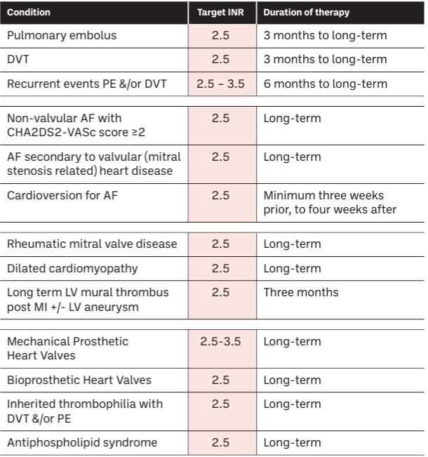 Table 1: Indication for warfarin, target INR and duration of therapy