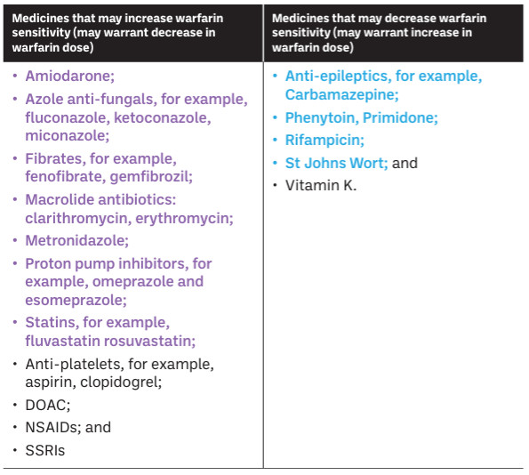 Drugs which are liver enzyme inhibitors interact with warfarin and increase the INR, and drugs which are liver enzyme inducers interact with warfarin and decrease the INR. There are other drugs which have other mechanisms of interaction, which further increase the risk of bleeding in patients on warfarin, often synergistically, where the sum of the risk is greater than with either drug alone (see Table 2). Patients should not be on both a DAOC and warfarin and any prescriptions for the use of the two medicines together should be queried.