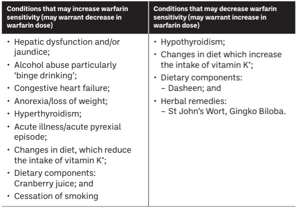 Table 3: Food and conditions that may affect warfarin sensitivity